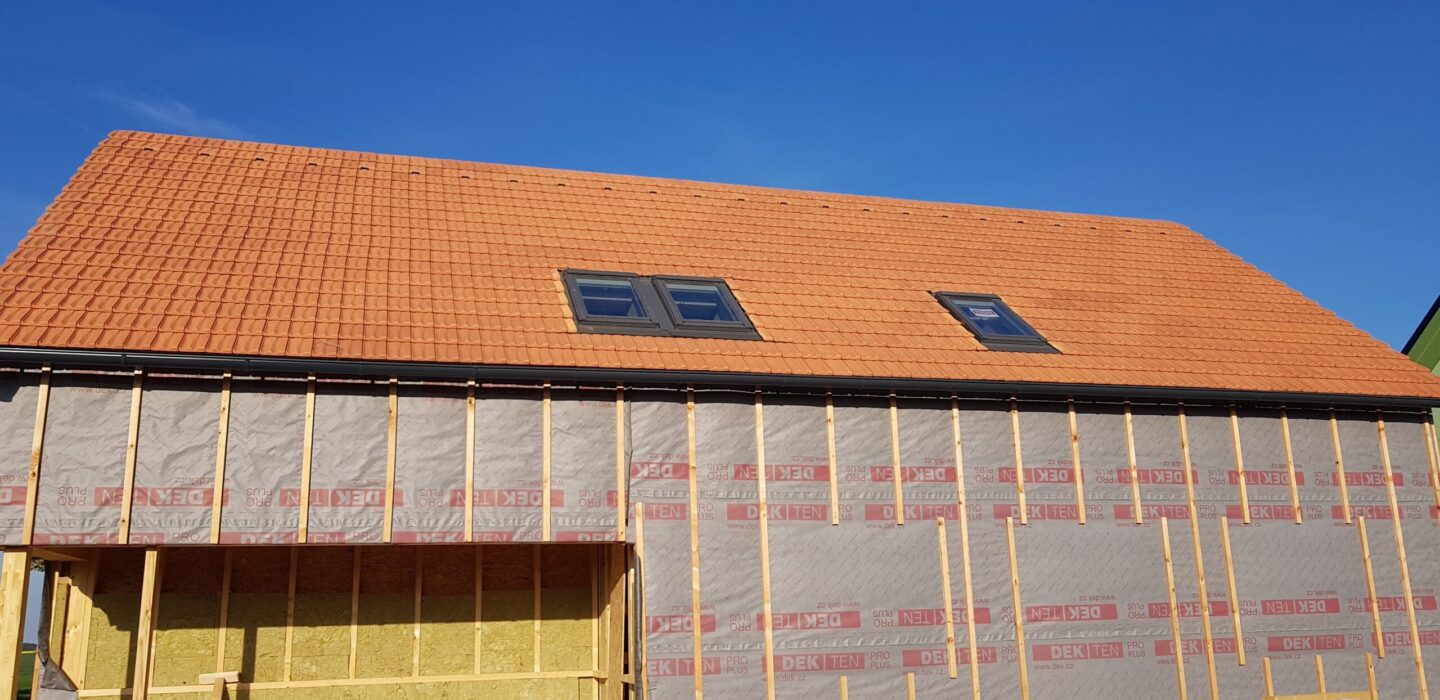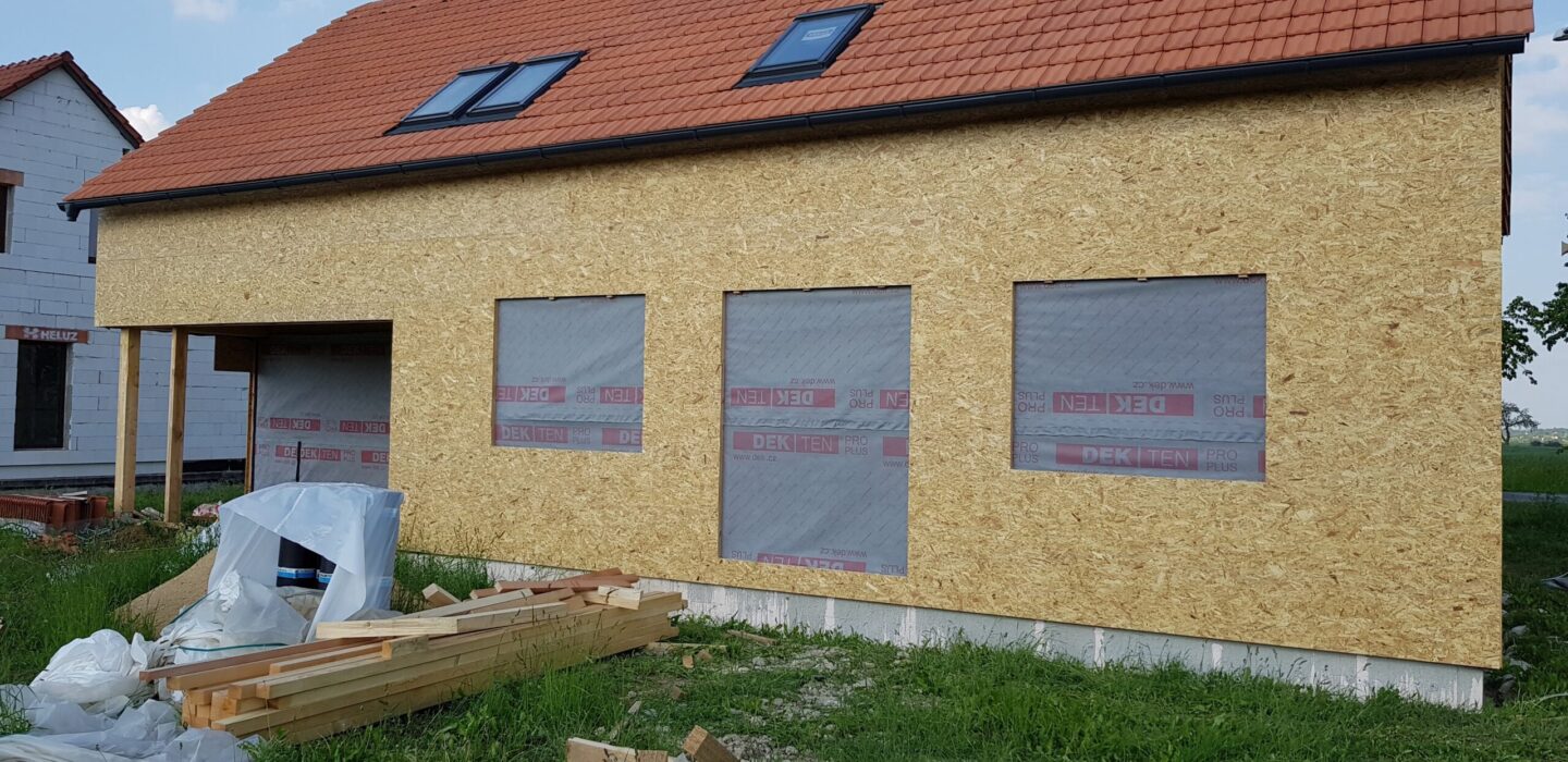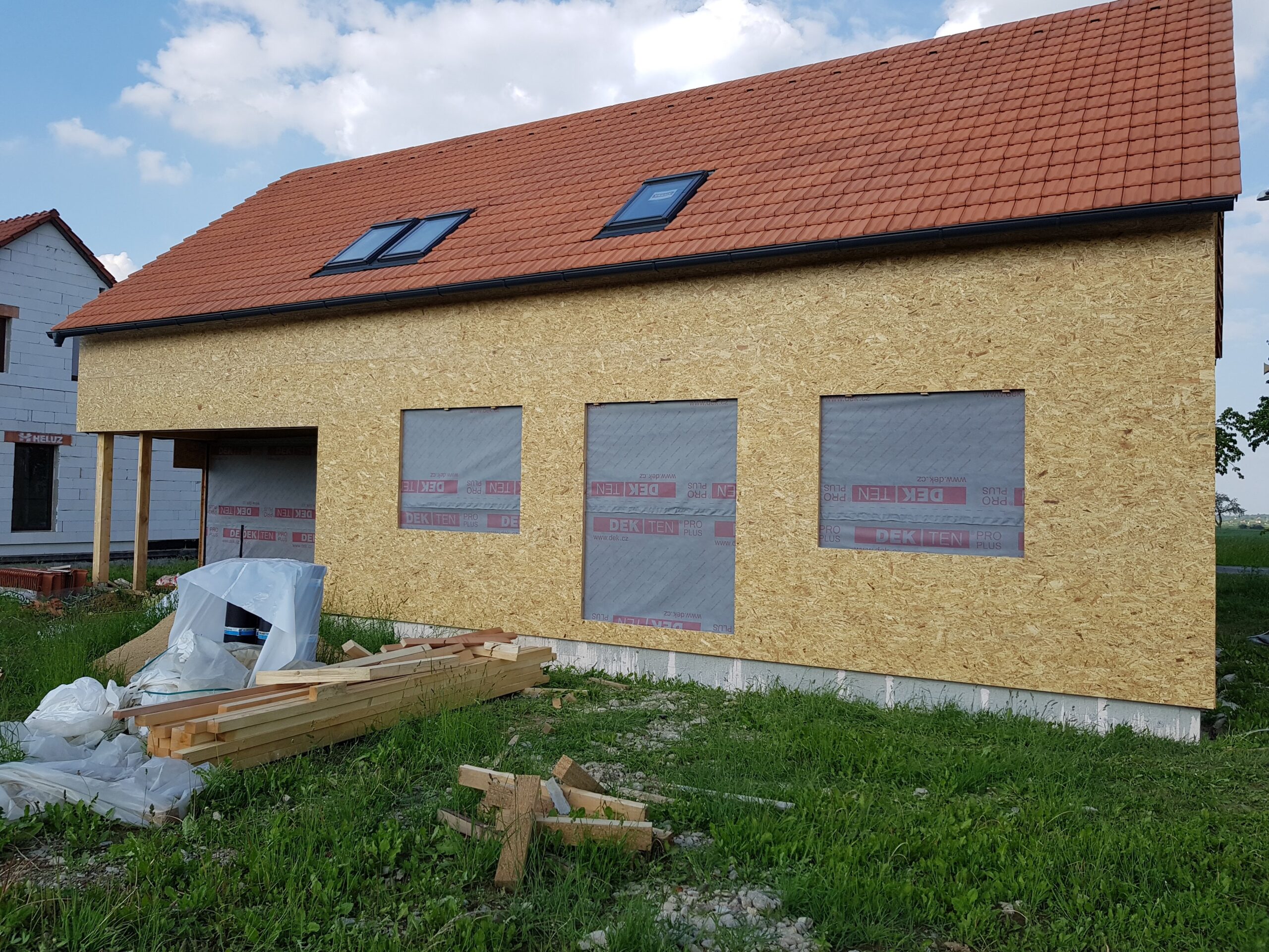 - Montáž fasádní UV difusní fólie, Izolace a OSB desek na stěny a strop